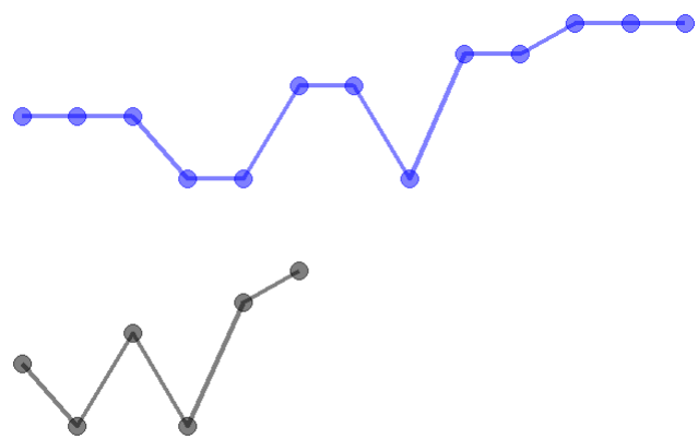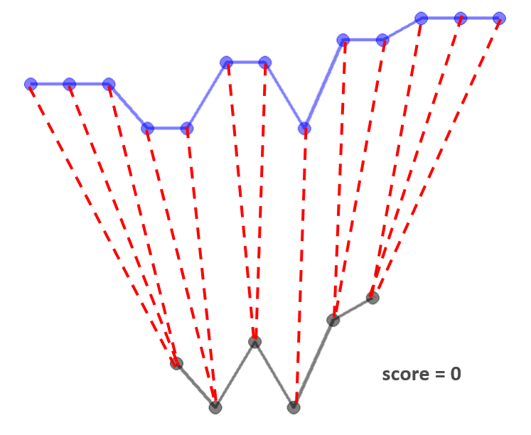 By connecting the points with a dashed line (connectors) based on the warping path, we can visualize the association between the two curves. Averaging the length of each connector, we can get a DTW score for the dis-similarity between the two curves since a more similar candidate curve will have a smaller DTW score. By going through the algorithm, DTW allows for stretching or compressing one curve relative to the other to find the optimal alignment of their points.