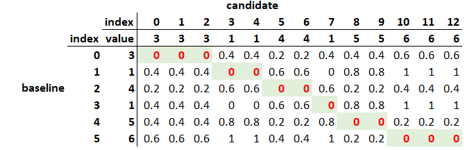 DTW first calculates a distance matrix with each cell value being the distance between two points from baseline and candidate curve respectively. Using this matrix, we can find the path that has minimal distance.