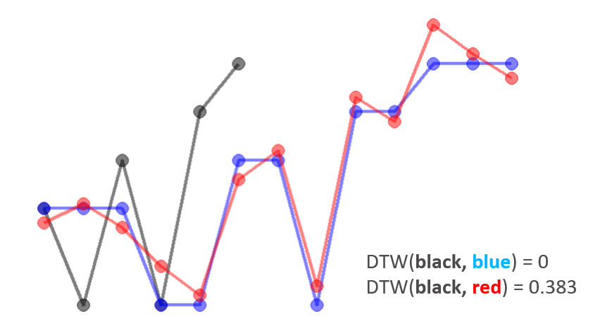 Now we can use the DTW score to compare (dis)similarities between different candidate curves to the baseline curve. Given the two candidate curves (blue and red), we can see that blue curve is more similar to the baseline (black) curve than the red curve. We expect red curve will have a larger DTW score and the DTW scores aligns with our expectation.