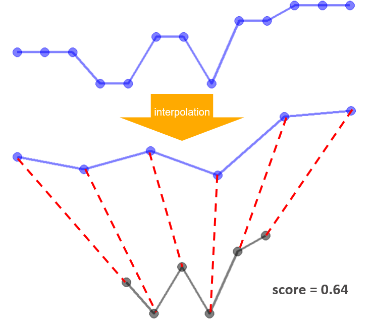 Before the DTW computation, pDTW interpolate the candidate curve so that it has the same number of points as the baseline curve. After each alignment from DTW computation, if there is any redundant connectors at either end of the baseline curve, points from candidate curve will be removed. In order for the candidate curve to have the same number of points after removing the redundant points, interpolation is performed on the candidate curve. This process is repeated until there is no redundant connectors in the DTW alignment. Then, it returns the DTW score.