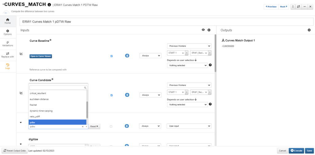 In d3VIEW Workflow, there is a Curves_match worker that provides a variety methods for comparing curves. We can choose “pdtw” to calculate the pDTW score.