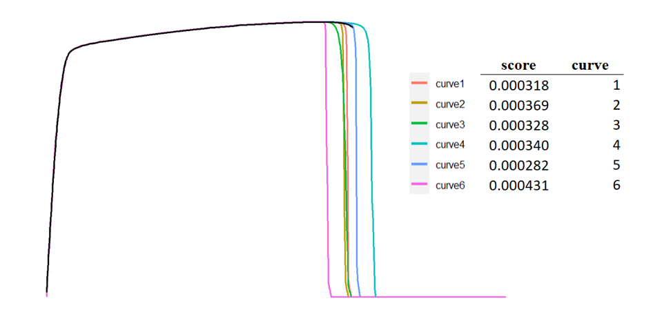 Finally, scaling of the curves due to the engineering considerations happens all the time. The scaled curves have the exactly same shape as they did before and their relative position to each other remain unchanged. However, as the DTW algorithm measure the difference directly from point values, we will get a different score. This can be taken care of by adding a normalization procedure before pDTW computations. We normalize the baseline curve so that the baseline curve is in a unit box (a [0, 1]*[0,1] region) with vertical and horizontal scale factors. With the same scale factors, we scale the candidate curve. Thus, the candidate curve may not entirely lie on or within the unit box. The advantage of this normalization process is that as long as we are comparing candidate curves to the same baseline curve, we can normalize the curves however we want, it is not going to affect their relative positions and shapes and thus provides a consistent DTW score, as demonstrated below.