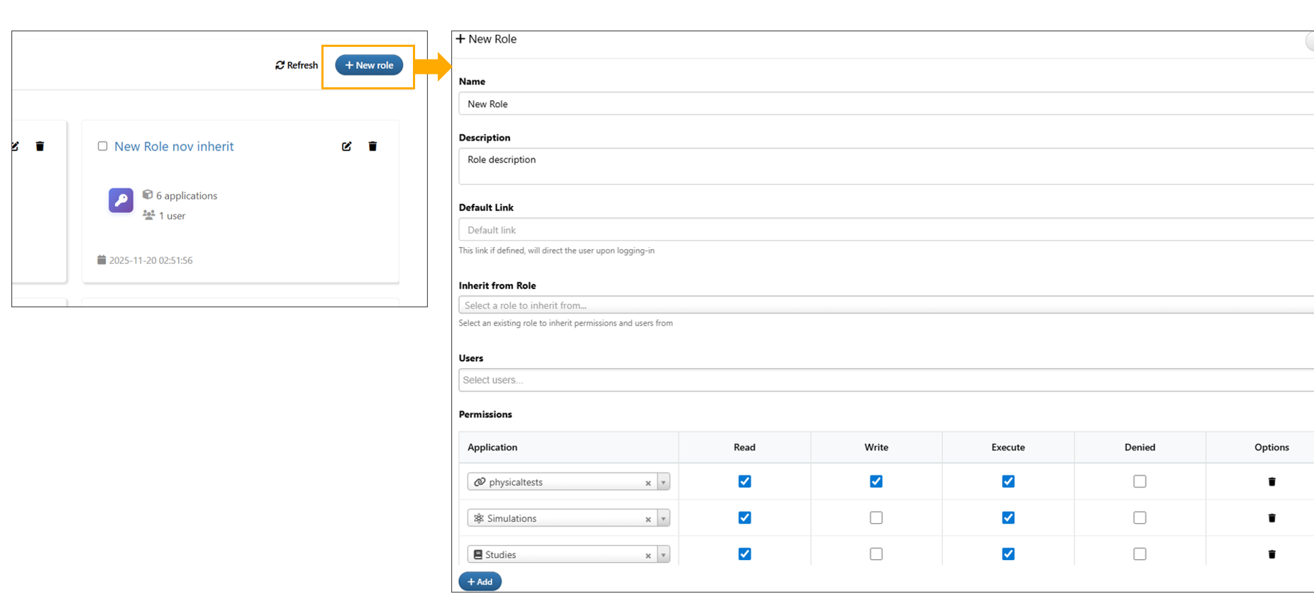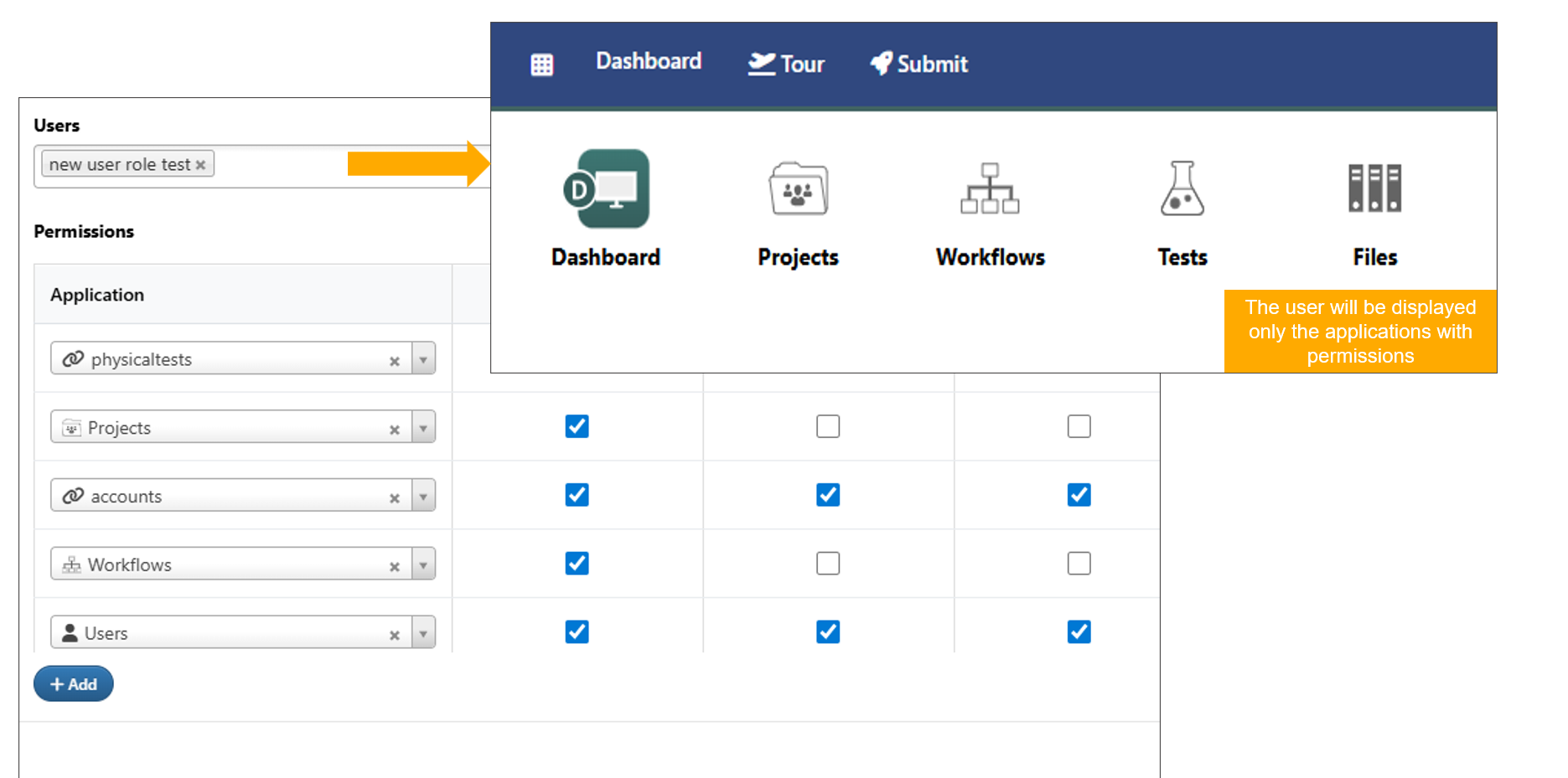 Applications with Permissions can be added to Roles and users can be assigned to the Roles while creating or while editing a Role