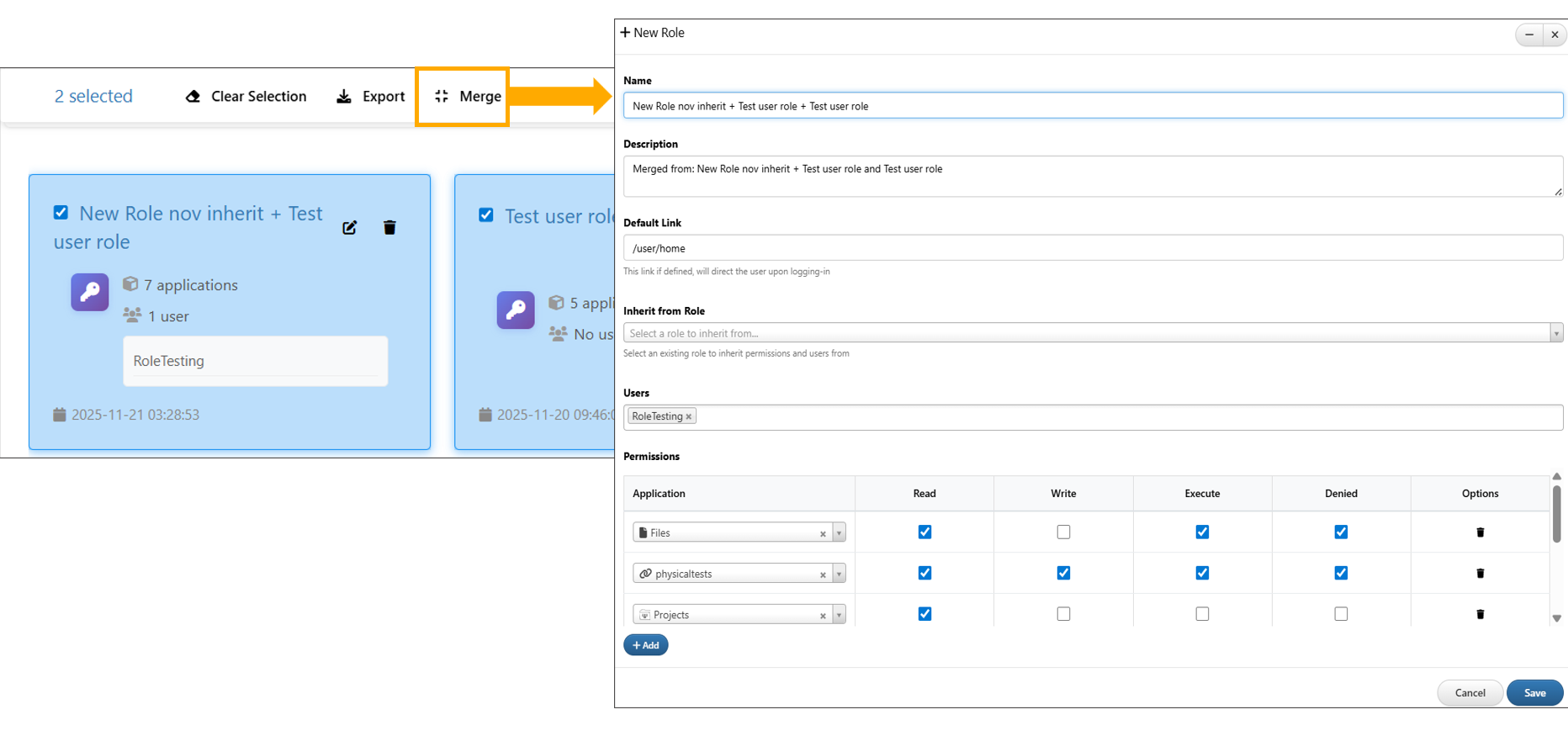 Selecting two roles now shows a new “Merge” option, allowing you to combine their users and permissions into a single role.