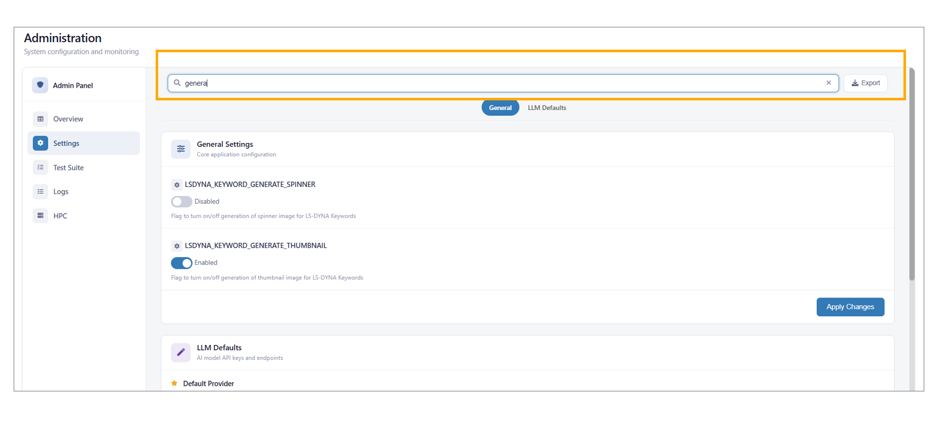 - Provides all administrative configurations, including default LLM settings.