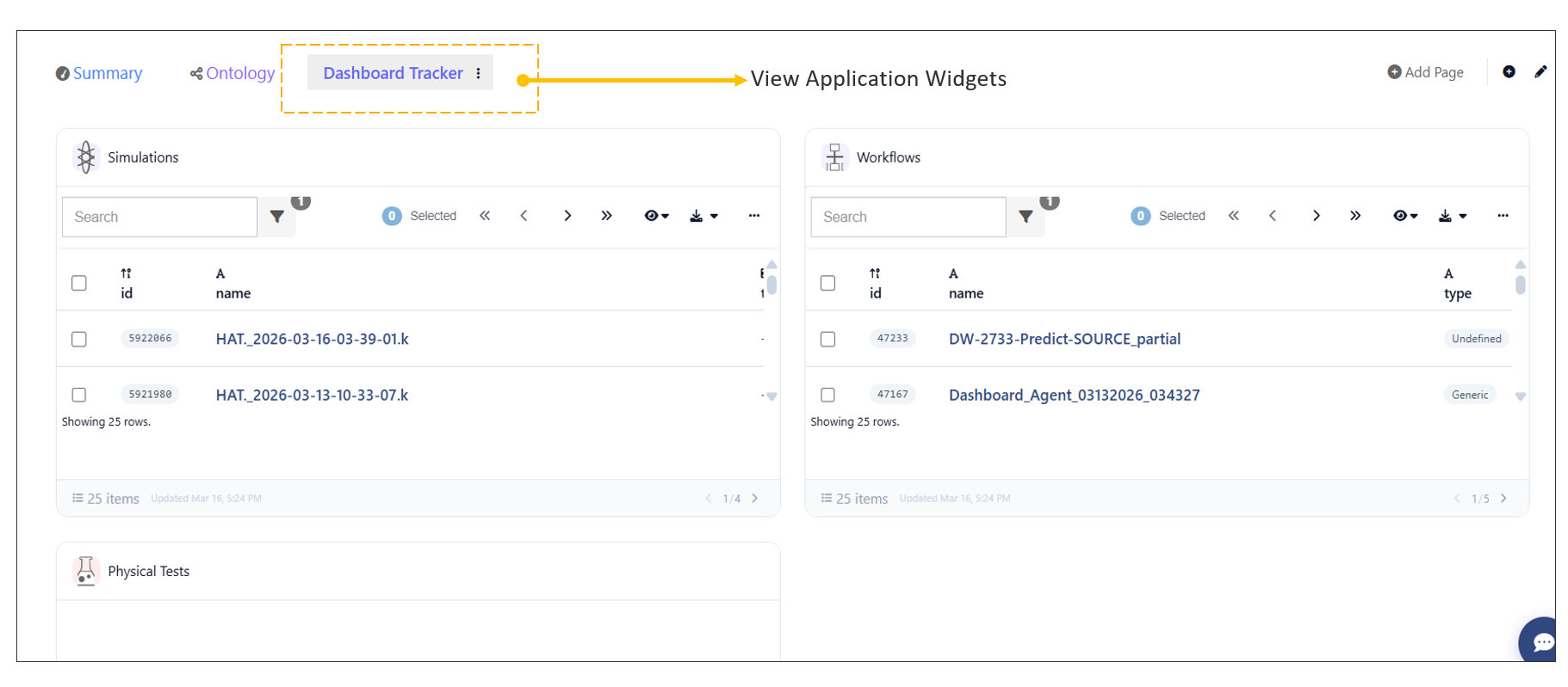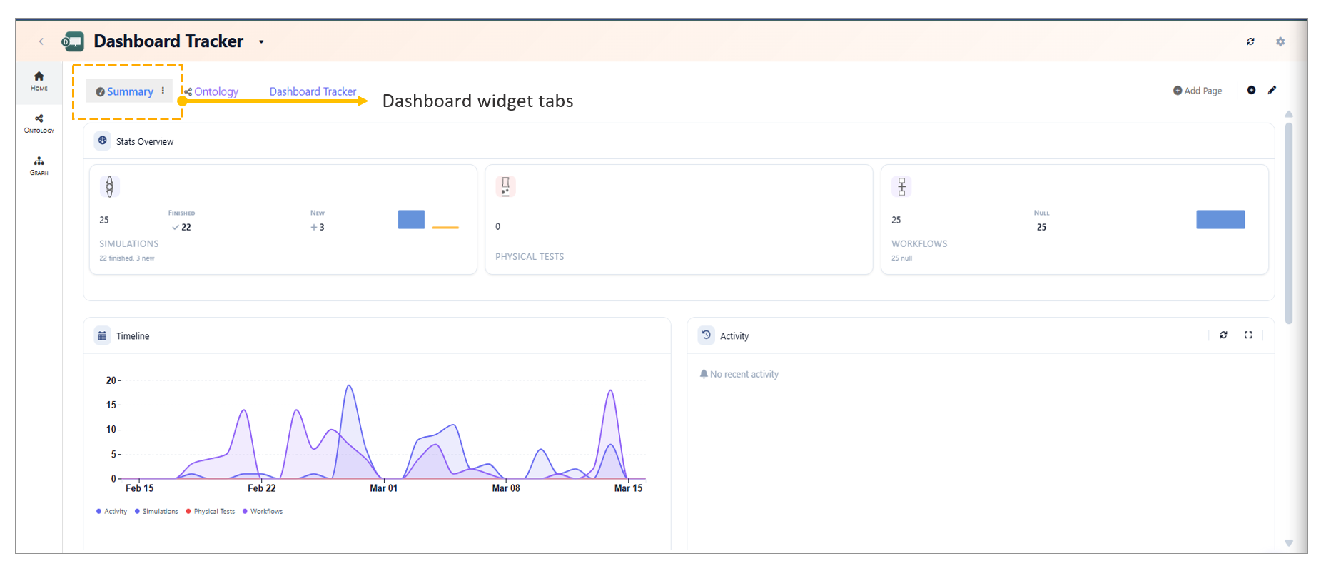 - Stats Overview: Tracks total counts and status (e.g., 25 Workflows, 2 Simulations finished).