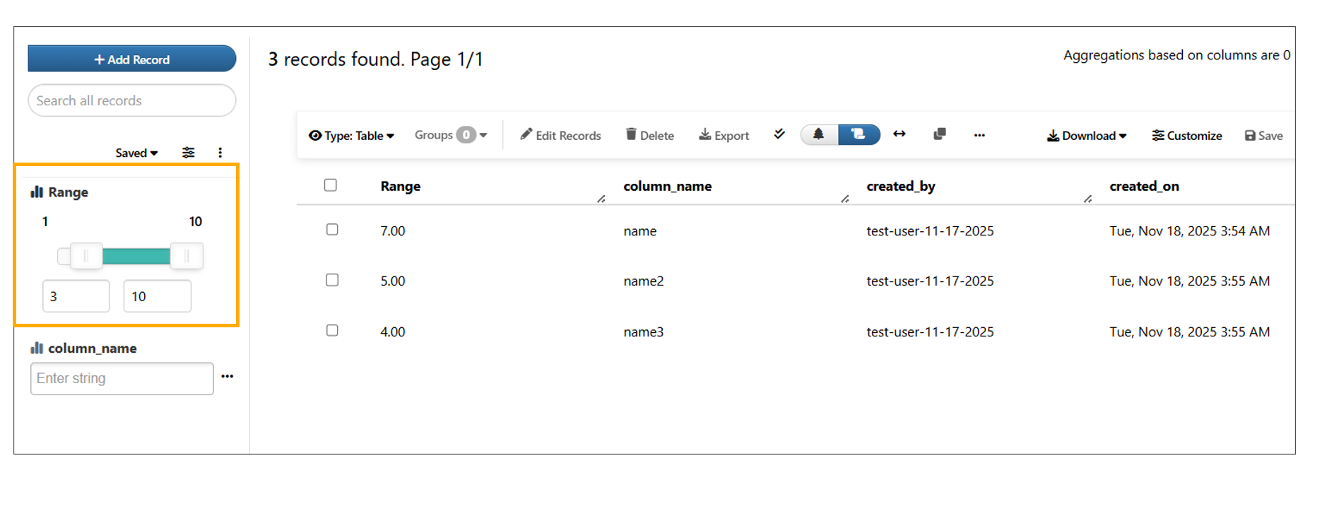 Range input field filters are now supported in databases. We can filter the records using slider available in the range input filter.