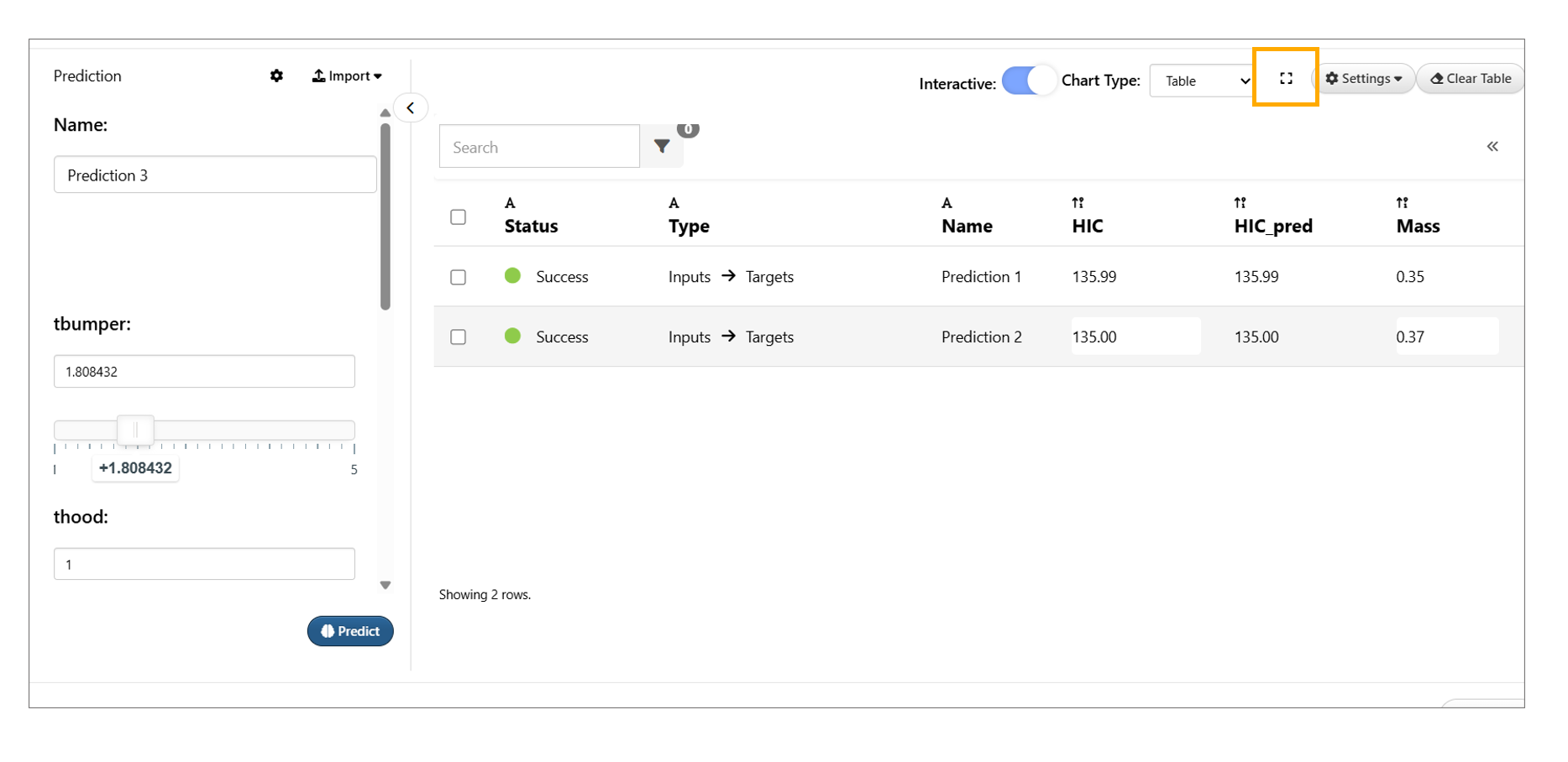 In ML Saved Model - Predict has a new header option called ‘Interactive’, along with other options to append a row and to select the source - Targets or Inputs, for choosing the slider value inputs