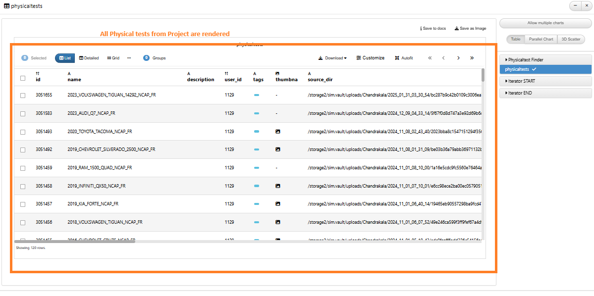 Add *PHYSICALTEST_FINDER worker to the canvas and select tge project in the filters from which the Physical tests are to be obtained and execute the Worker.