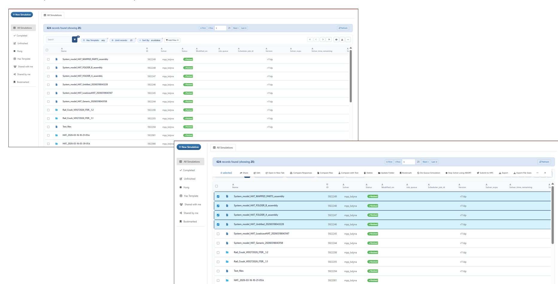 Multiple records can be selected in simulation or physical test in simulation to physical test compare modal.
