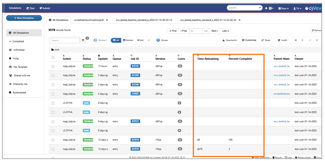 Simulation data table has two new columns called ‘Time Remaining and Percent Complete’ for the simulation records.