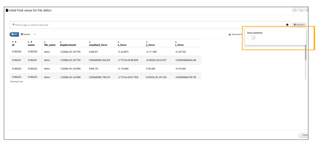 Settings is now available to toggle Sparkline Matrix with values in view initial and final values binout table.