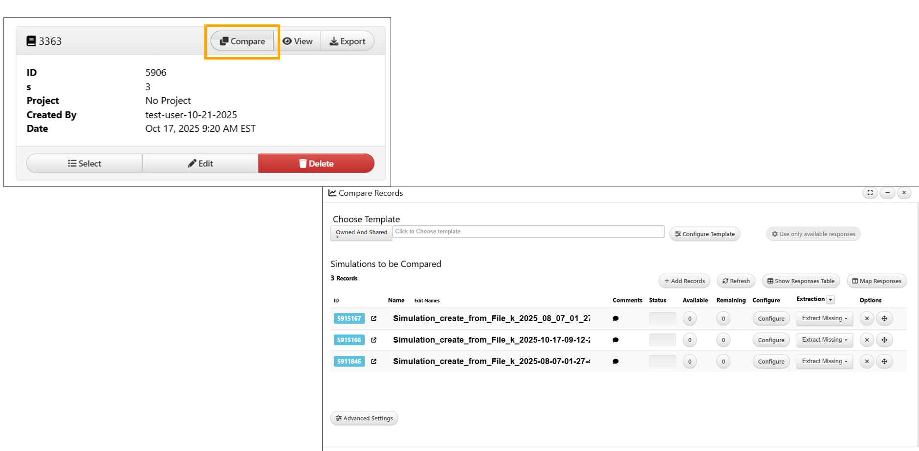 Every time you compare records a study is created. When you go this route, instead of filling out study specifications, you pick your records and open them up for comparison in Simlytiks. Go to your Simulations page and select your desired records. Then, right click and choose “Compare.” You can also select records from your Physical Tests page as well.