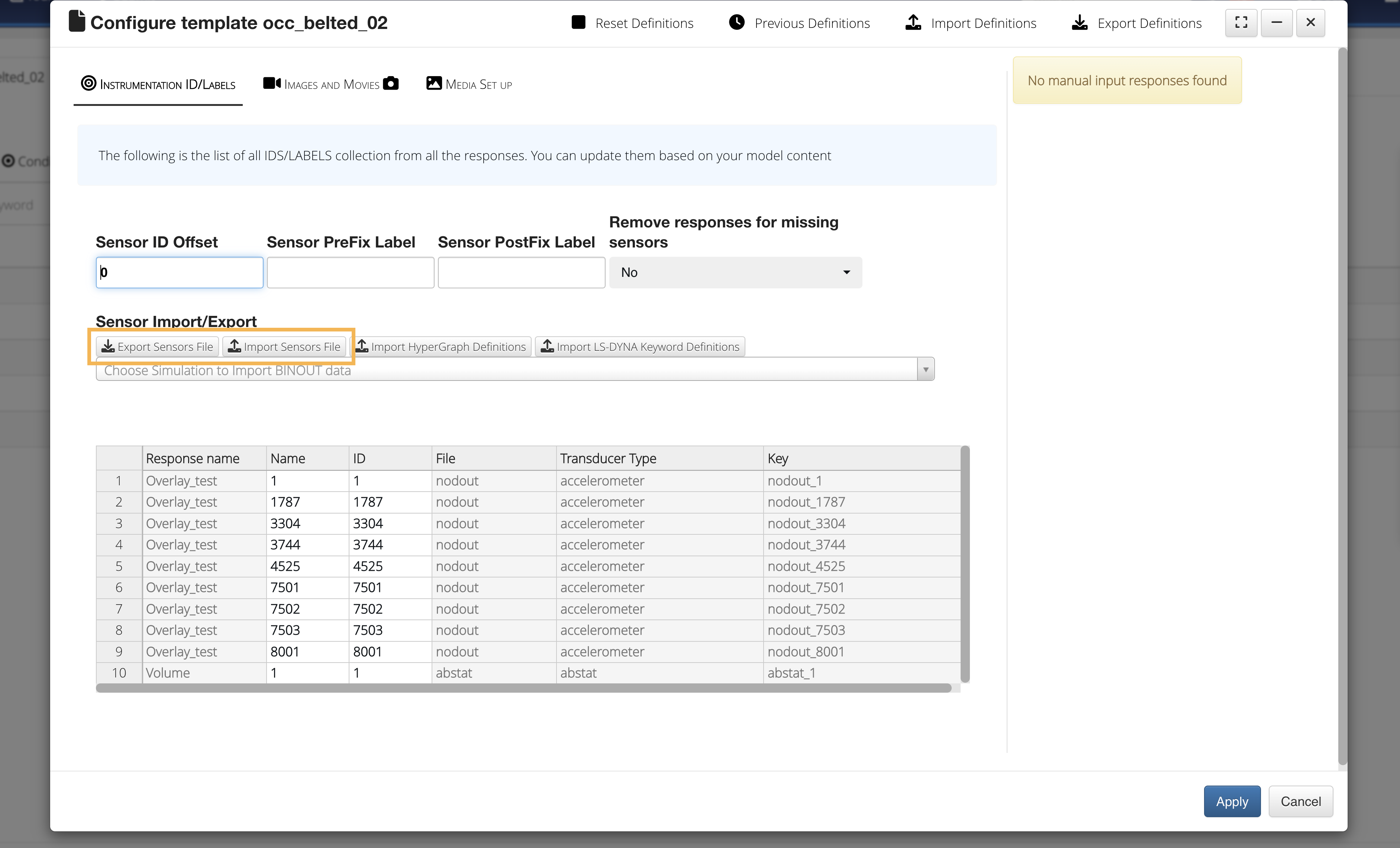 Configure the template under the template options menu. Here, you can manually edit the template or export sensors as a CSV to edit and import back again. For certain templates, we’ll need to make sure they can compute node IDs and Labels correctly. d3VIEW processes them by first looking for the label in the NODOUT, and then searches for the ID if the LABEL is not present. If both ID/LABEL are not found, d3VIEW will fail to extract the necessary data.