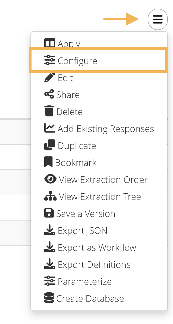 In this step, you can choose Configure to customize the NODE ID/LABEL to suite you model. Once this option is clicked, you will be directed to a table that allows you to view and edit your model specific ids/labels. Under the hamburger menu in the opened Template, click on Configure to get started.