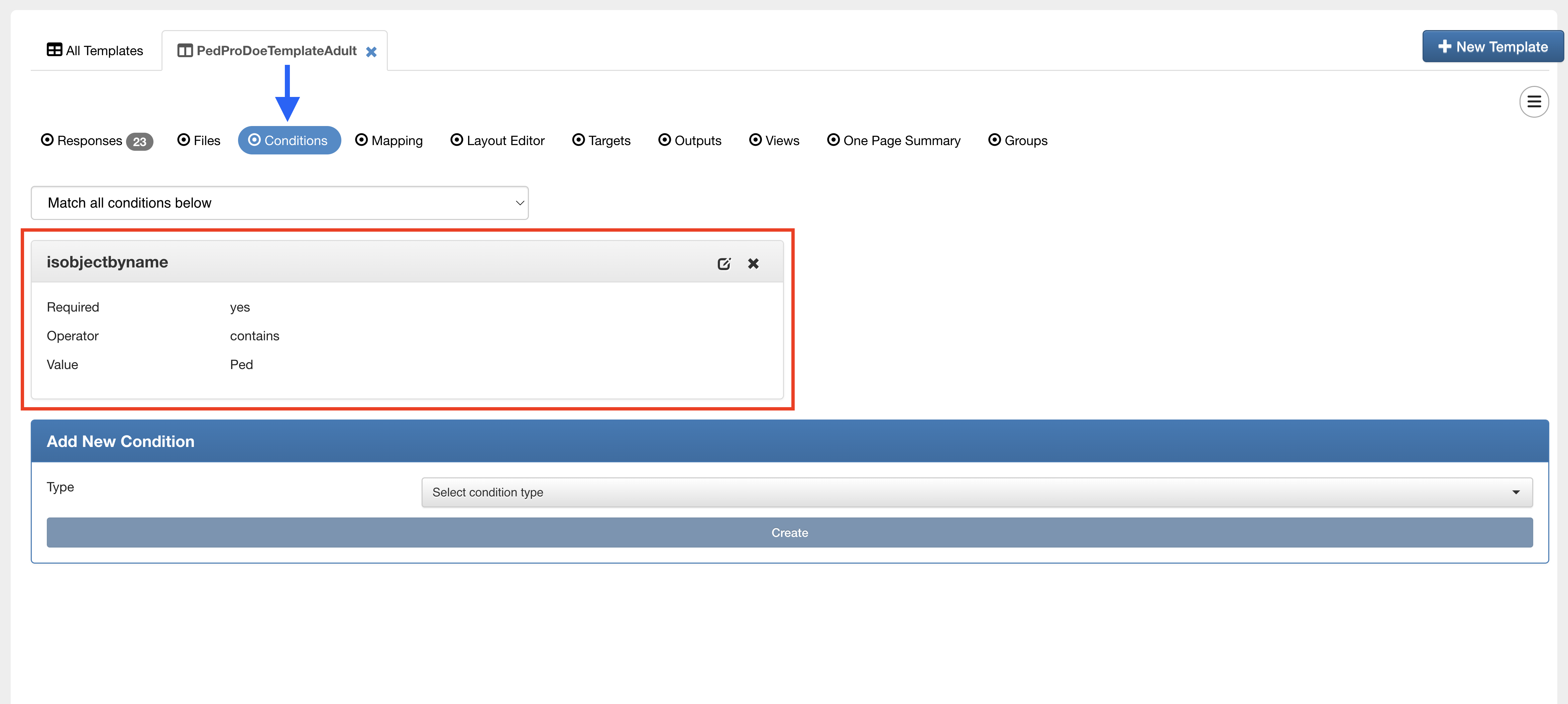 Click over to the “Conditions” tab. Fill out the New Condition form based on your future simulation(s). The following image shows choosing “Object Name” that starts with ”HAT” for Simulations that start with the name “HAT”. Click on “create” to officially add the condition to the template. You can add more or delete conditions if needed.