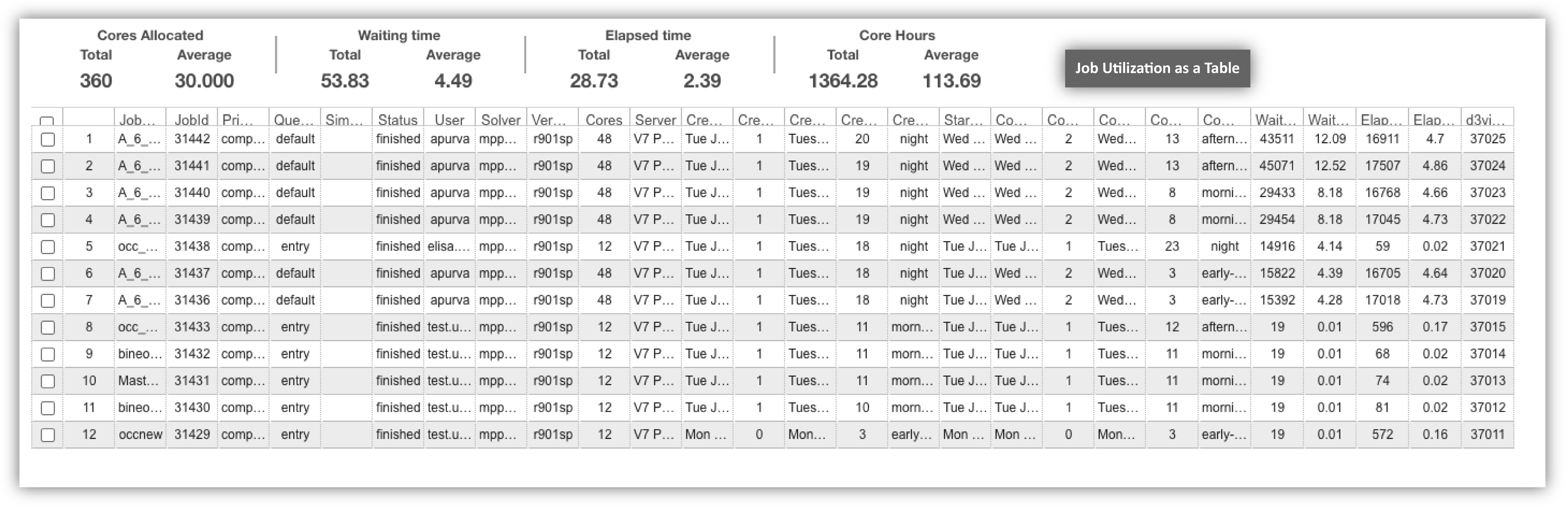 This first tab, Server Utilization, gives a visualized breakdown of what jobs, cores and solvers are being run on the server.