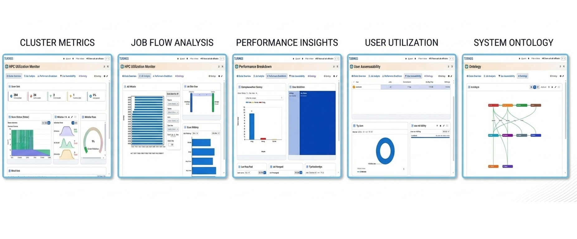 A new Turings view is now available, featuring Cluster Metrics, Job Flow Analysis, Performance Insights, User Utilization, and System Ontology for enhanced system insights.