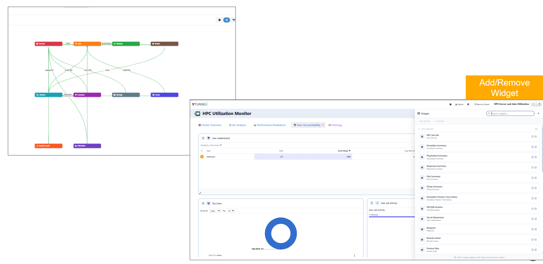 Enhanced Turings dashboard by ensuring full visibility of all HPC entities in the Data Graph, complete ontology representation in the ER Diagram, and improved widget management with persistent add/remove functionality on refresh.