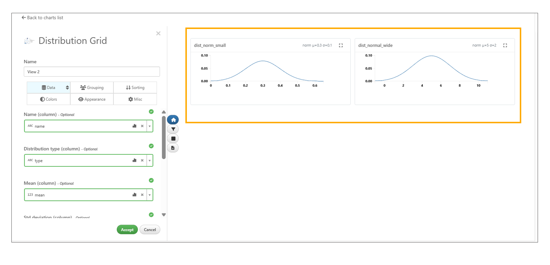 We can add inputs by dragging and dropping data columns from the left panel of Responses or choosing them in the drop-down menu that appears when clicking in the input box. Once we indicate required inputs, we’ll see a preview of our chart. We can use the real-time preview to explore options and choose exactly how we want our chart visualized before accepting it. Watch the following video to see how it’s done.