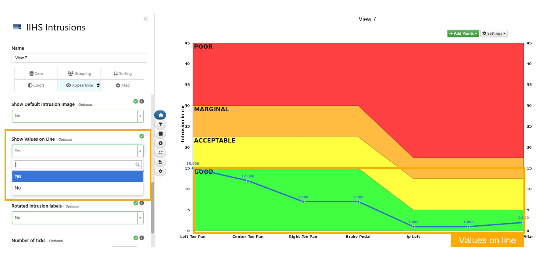 In IIHS Intrusion chart, the Appearance tab now includes a ‘Show Values on Line’ option to display intrusion values and circles on IIHS chart lines.