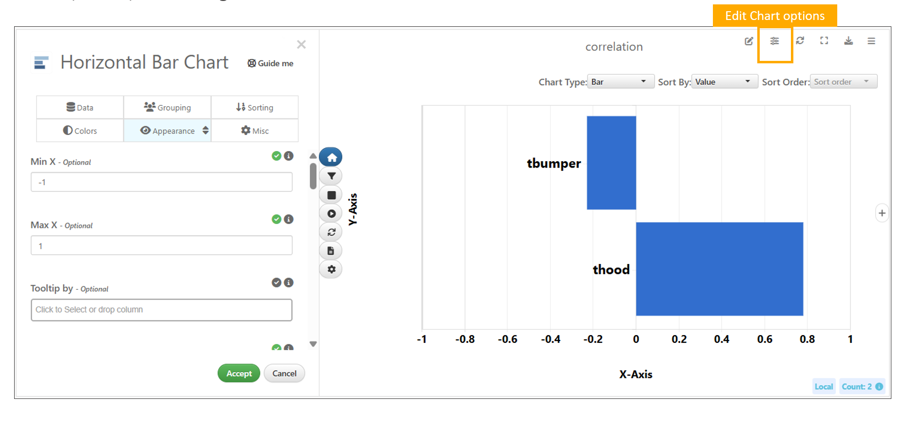 The quick edit option is available for bar charts and bubble chart to change main inputs such as x data, y data and label by. To open the quick edit drop-down, click on the parameter icon in the top right corner of the chart area. Watch the video below to see a quick editing example for Bubble Chart: