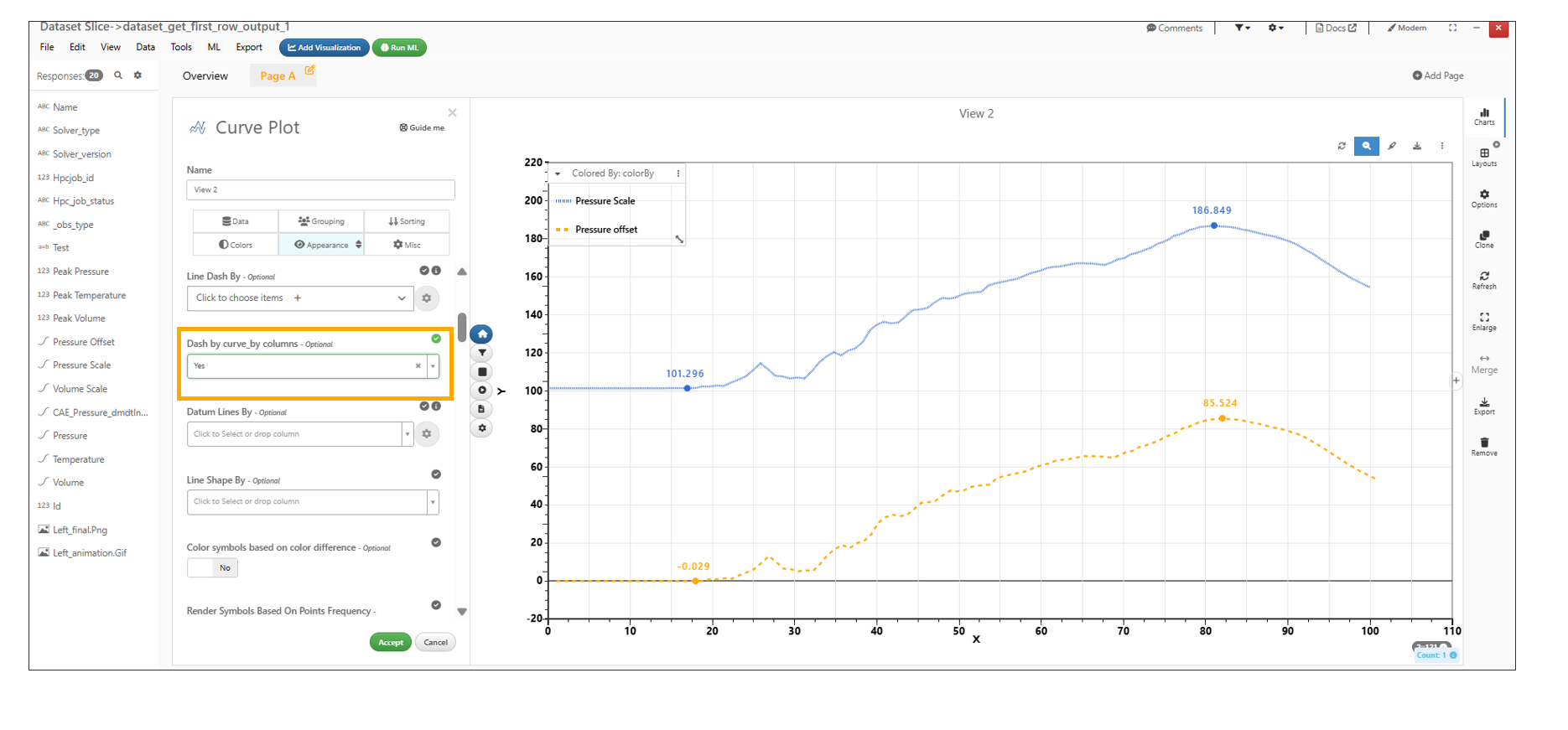 In Simlytiks, a new option Dash by curve_by columns has been added under the Appearance tab for curve plots.