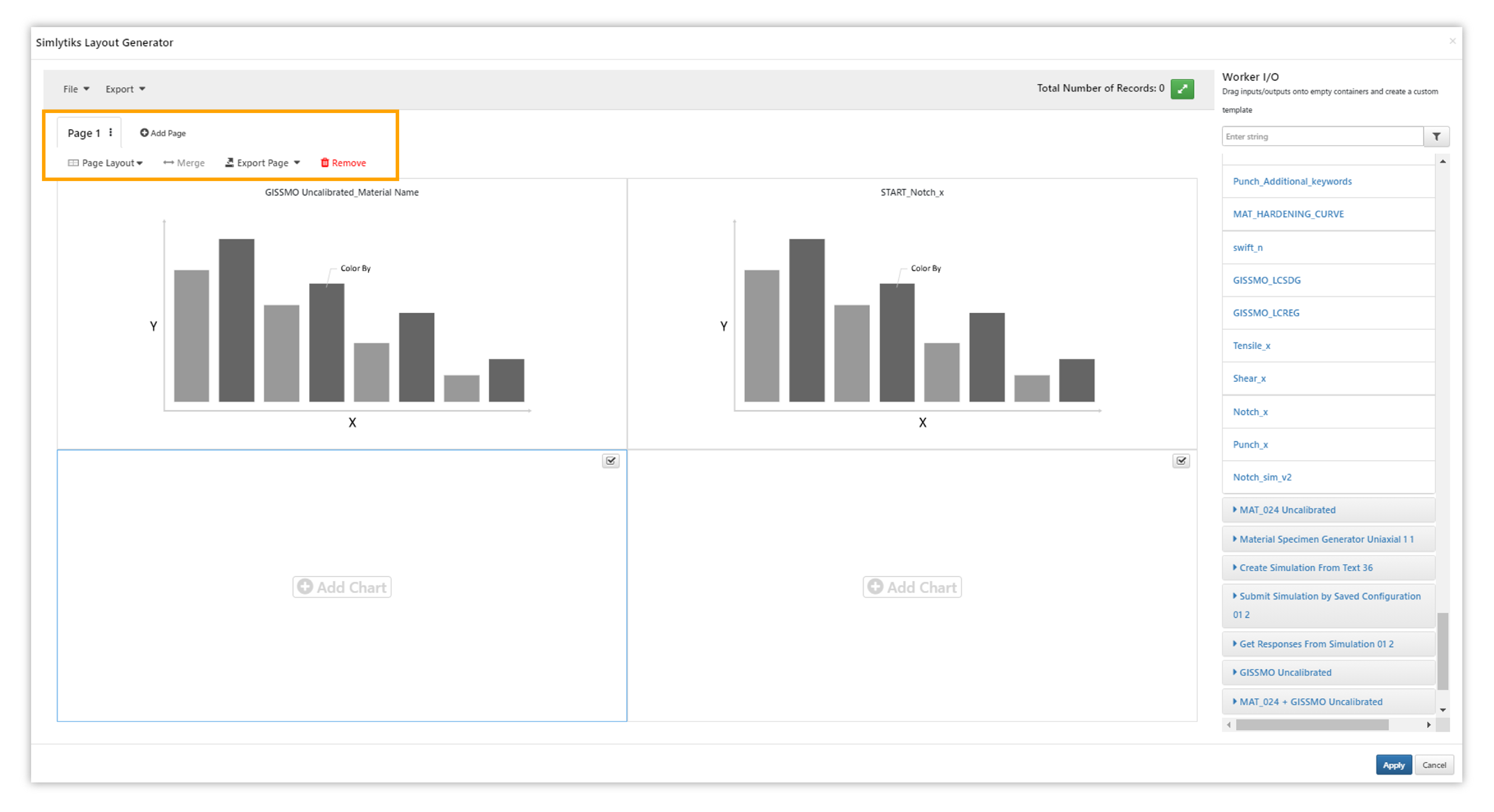 Just like with data columns in Simlytiks Dashboards, we can drag worker input/output info into the report area as charts.