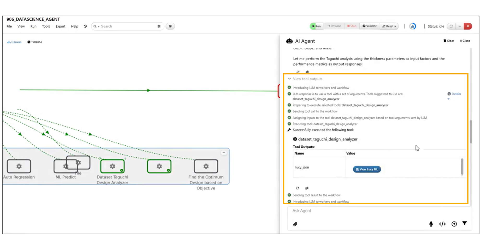 A new message in the AI-Agent chat generation summary indicates executed tools and viewable outputs.