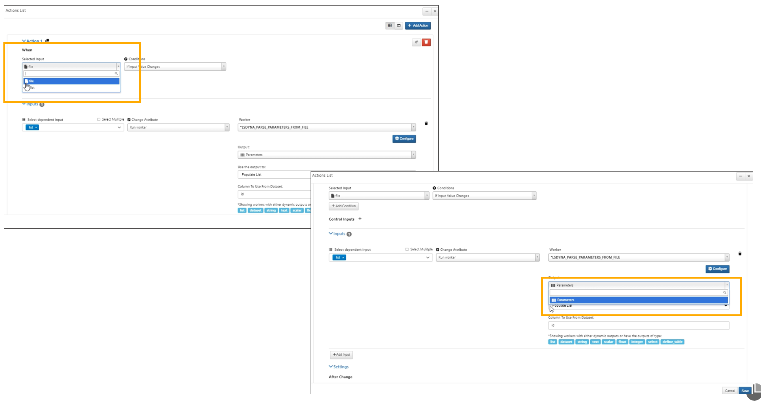 When multiple inputs are selected and added to actions using context menu , then the inputs selected are automatically available in the dependent input list under actions.