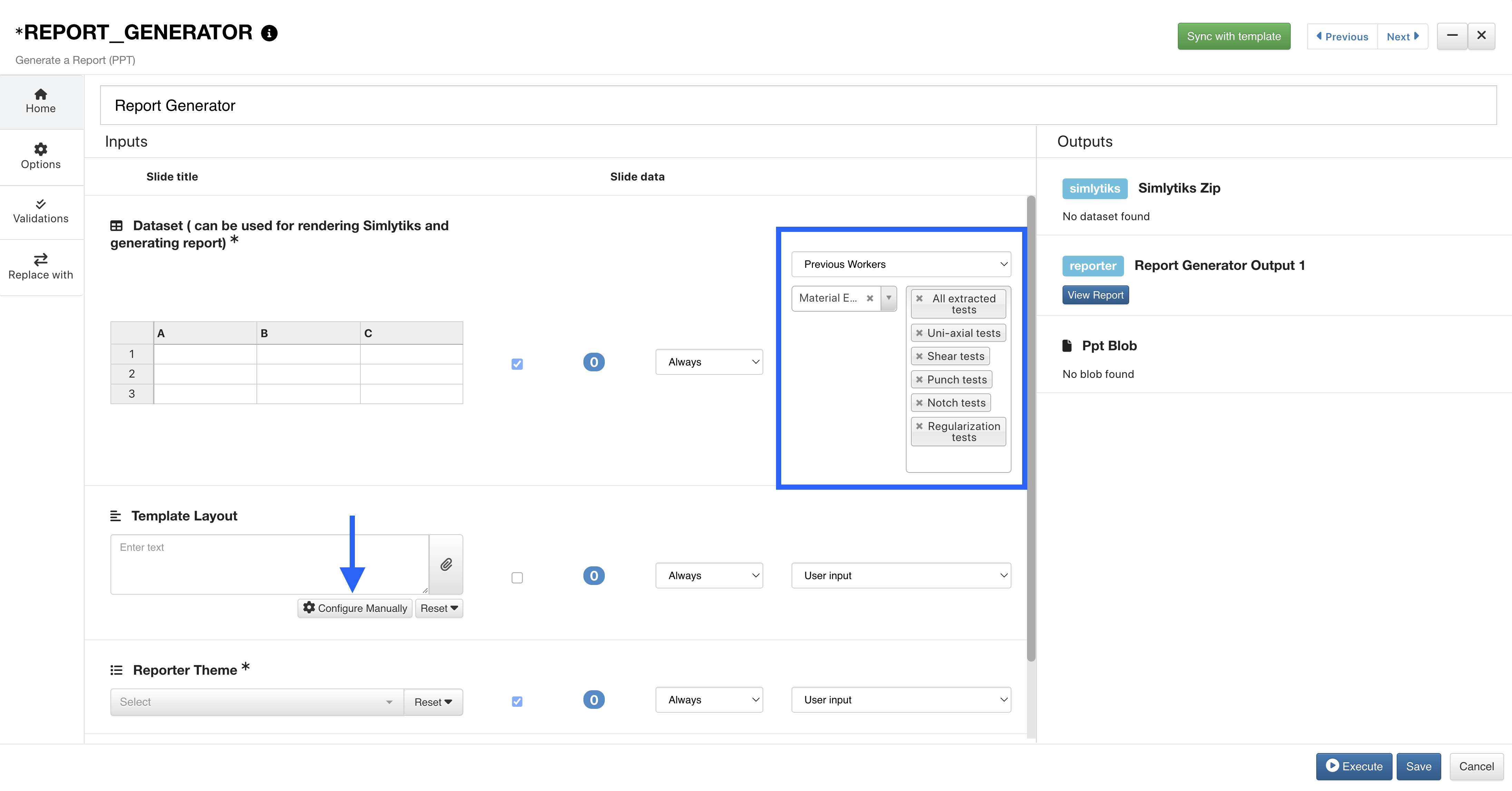 Let’s open our Report Generator worker, and in the dataset option, we’ll choose Previous Workers.
