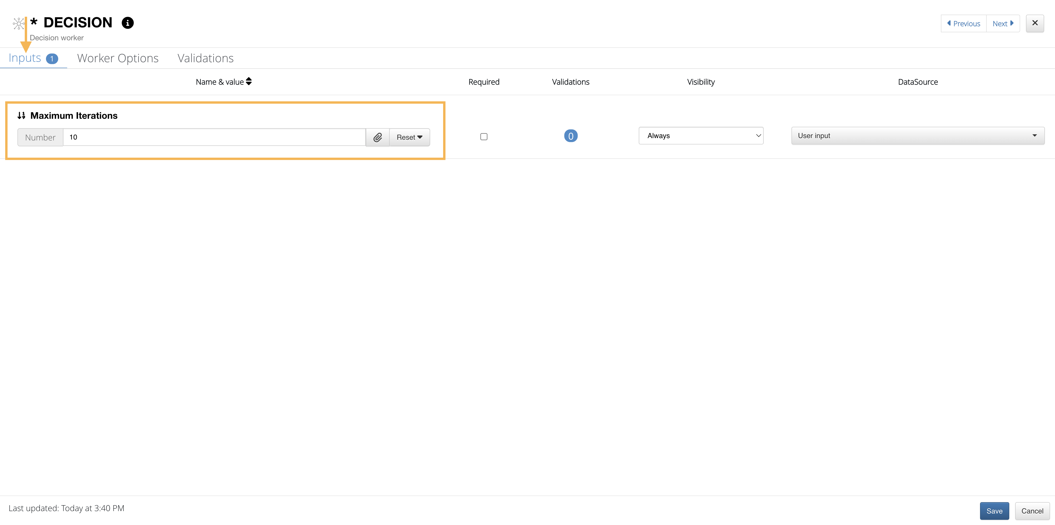 Click on the decision hub to start configuring it. From here, we’ll make sure to choose the max amount of iterations in the input tab.