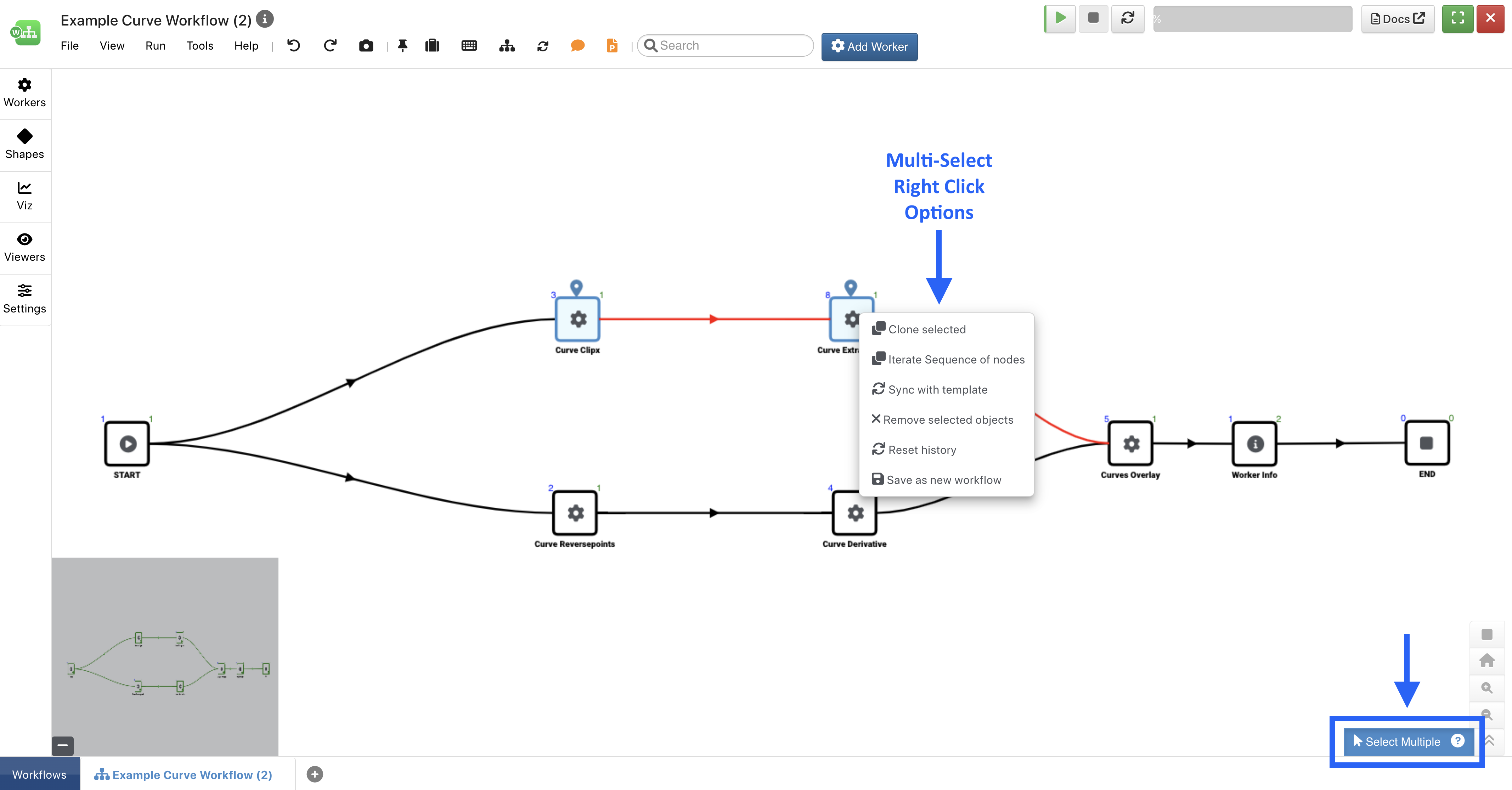 With the bottom-left multi-select button turned on, we can select more than worker. Now when we right-click, we can remove or clone all selected workers, save them as a new workflow and even sync them with a template.