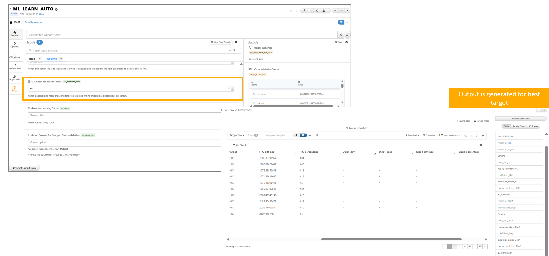 The *ML_LEARN_AUTO worker now includes a new input, Build Best Model per Target. When enabled and multiple targets are selected, the worker evaluates different regression methods for each target and automatically selects the best model per target.