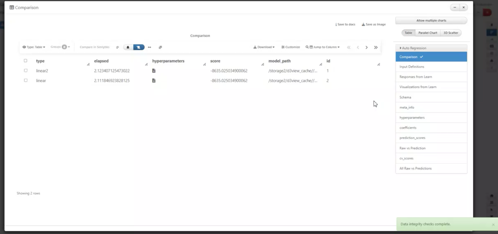 The ML_AUTO_REGRESSION worker now includes hyperparameters in the compare output within Workflows.