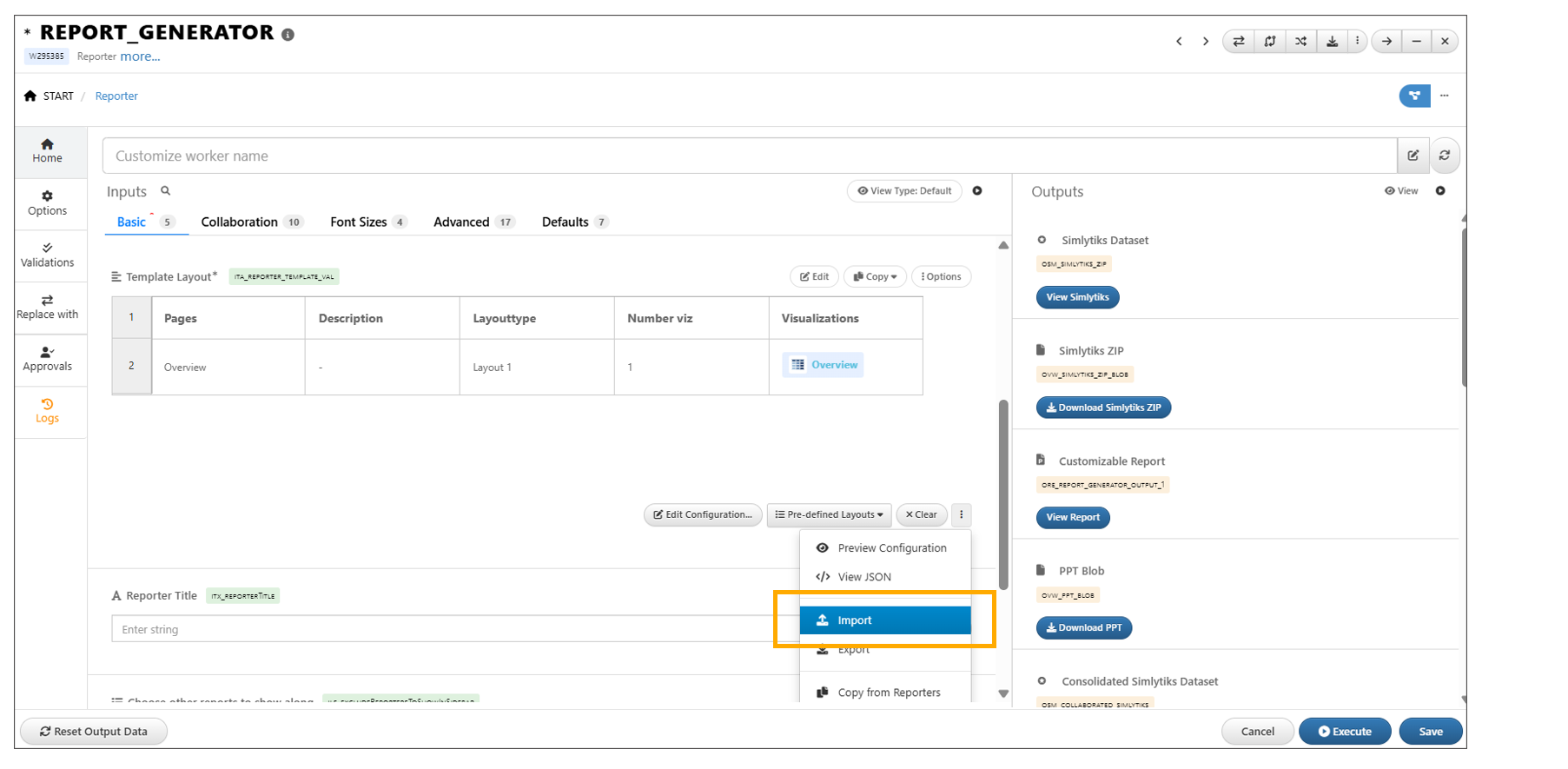 Layout template configurations can be imported to *REPORT_GENERATOR worker using Import option available in the ellipse.