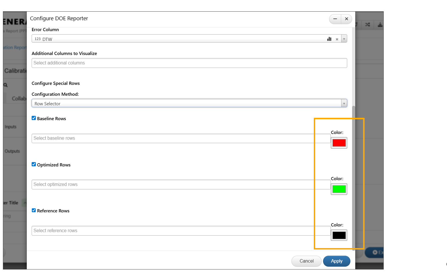 Report generator worker -> Color picker is now available for Baseline, Optimized and Reference rows in ‘Configurator DOE Reporter’ option under pre-defined layouts.