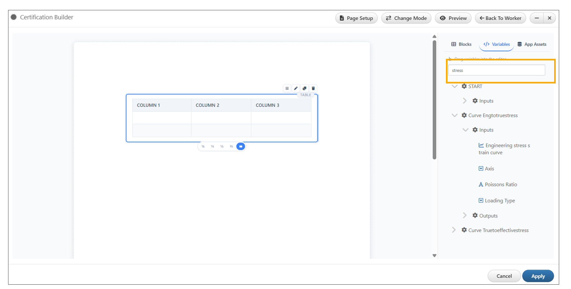 Search functionality is now available for variables in the Certification Builder worker editor. This enhancement allows users to quickly locate and manage variables within complex workflows.