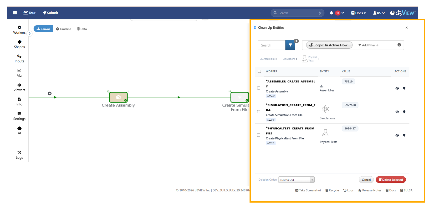 Workflows → Tools now includes a Data Cleanup utility that scans workflow workers for created entities, groups them by type, and enables search, filtering, selection, and bulk deletion with quick access to related configurations and details.