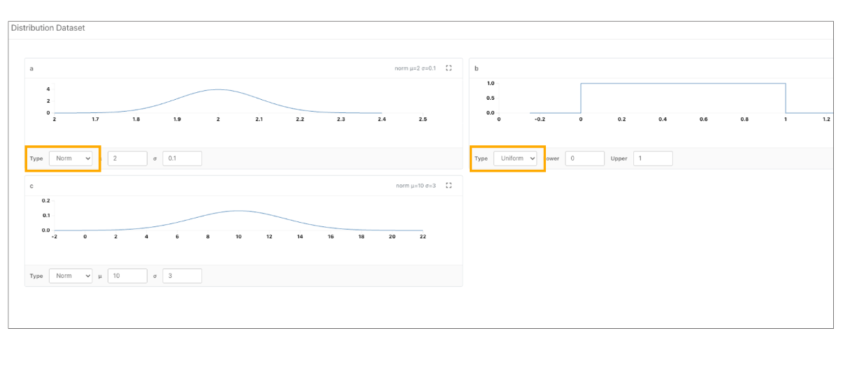 In Start Worker, datasets containing distribution data can be edited in the “Distribution Grid “view. Go to Options → Show Distribution Grid to access number inputs below each chart. Modify the “mean or standard deviation” for a normal distribution (or lower/upper for uniform) and click Apply to update the dataset values.