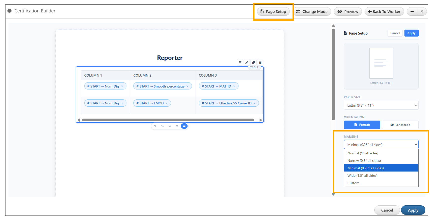 Minimal Margin Preset in Certification Builder Page Setup¶