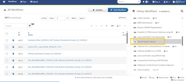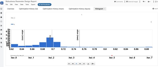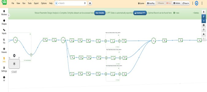 When the workflow execution is complete, a notification message with direct access to Simlytiks Dataset, PPT Slides, and the robustness optimal record will be showing on the banner at the top of the canvass for easy access. The Simlytiks Dataset include animation of the target histogram from each iteration to demonstrate target value and standard deviation changes throughout of the optimization process.