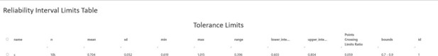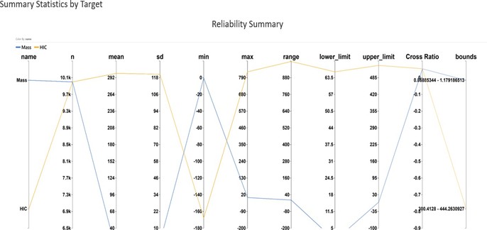 A bar chart is available to show the top features that has the highest “Ratio of points crossing tolerance limits” and a parallel chart is available to visualize the reliability summary statistics.