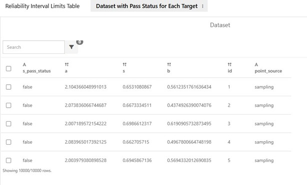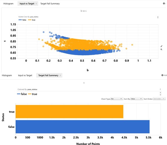 The second table includes all data points used for analysis for users’ further exploration. This table includes the input and target variable values as well as the pass status indicating if the point falls out of the specified lower and upper bounds. This table can be interactively inspected when it is opened in d3VIEW Simlytiks application.