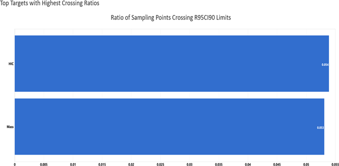 MMCRA generates a large number of new sampling points around the DOE optimal record. Based on the provided or trained ML model, we get the predicted values for each target variables. This new dataset can be used for evaluating how robust the solution is to noises. A summary table is available on the first page of the analysis report. It includes summary statistics as well as the tolerance lower and upper limits for each target variable. In addition, it shows the ratio of the points which crossed the tolerance limits.