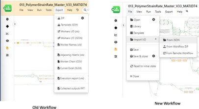 To allow data migration from an old workflow to a new workflow, the data from the old workflow can be exported using Export/Worker IO which will save the old workflow data into a file of the format JSON. Once this file is available, we can use the Tools/Import/WorkflowIO JSON in the new Workflow to overwrite its values with the values saved in the JSON file.