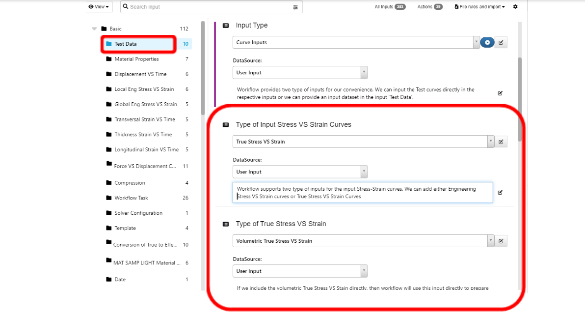 - Navigate the ‘Test Data’ subgroup and set the correct inputs for ‘Type of Input Stress VS Strain Curves’ and ‘Type of True Stress VS Strain’