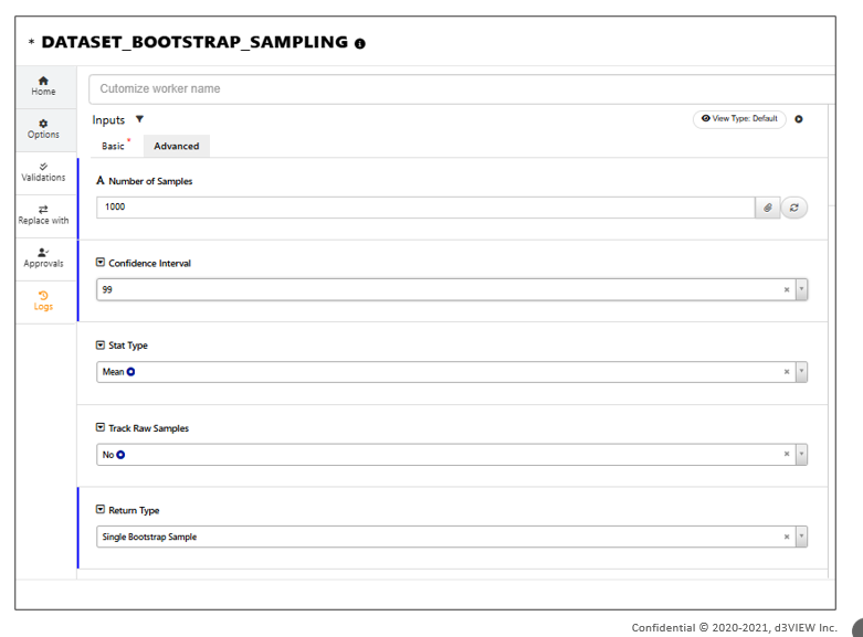 In Basic tab, we have Dataset input to add dataset and columns for which the bootstrap sampling is preformed
