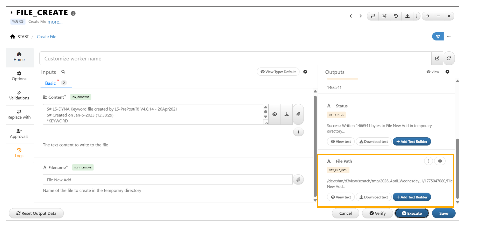 The FILE_CREATE worker now includes a File Path output, making it accessible for use within Workflows. This allows subsequent workflow steps to reference the created file directly by its path, improving automation and data handling.