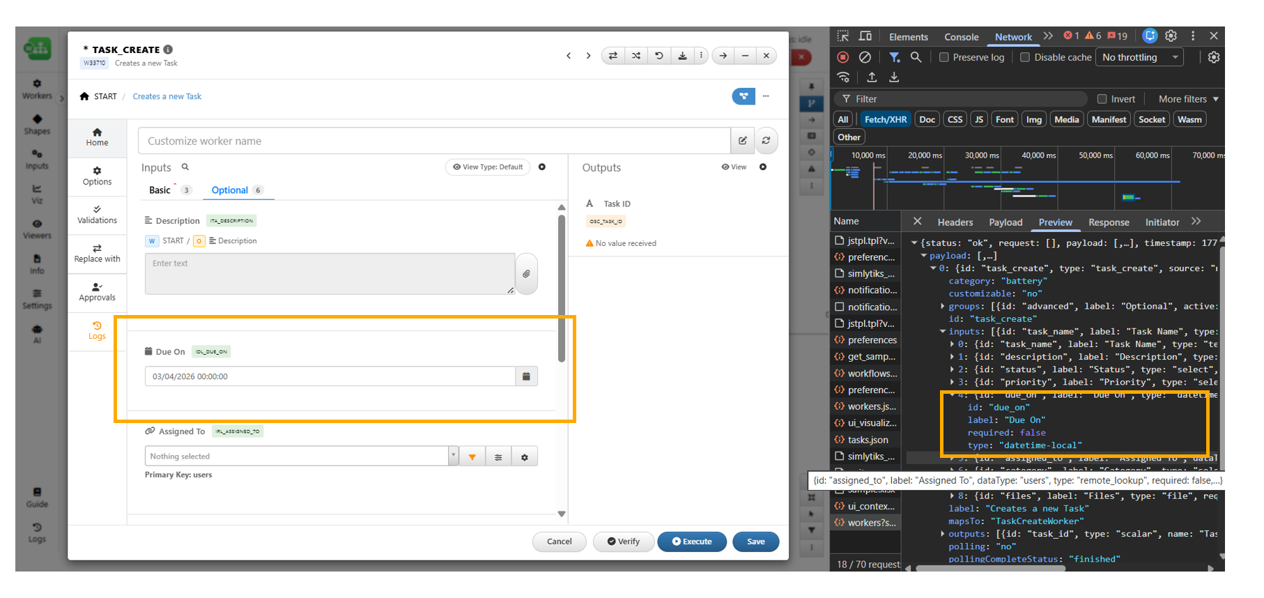 The TASK_CREATE worker now supports datetime values in the “due on” input field within Workflows. This allows tasks to be scheduled with precise date and time, improving accuracy for time-sensitive workflows. Previously, only date-only values were accepted.